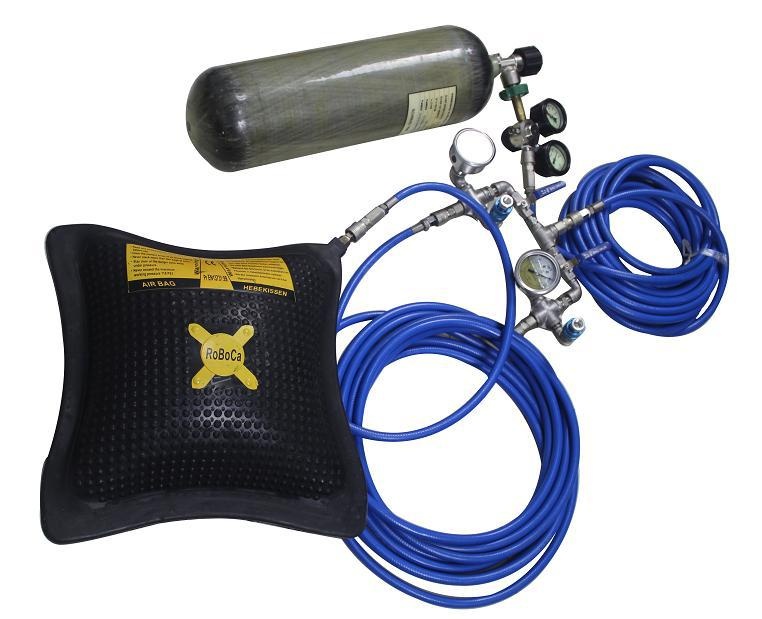 高壓氣瓶通過(guò)壓力調(diào)節(jié)器(減壓閥)的減壓,將25MPa的高壓空氣降低到0.8MPa低壓空氣,0.8MPa低壓空氣通過(guò)雙向控制器連接兩個(gè)氣墊或兩個(gè)氣囊,可完成兩組起重操作。控制器由雙向控制器和單向控制器兩種類型,顧名思義,雙向控制器可連接兩個(gè)氣墊或兩個(gè)氣囊,單向控制器可連接1個(gè)氣墊或1個(gè)氣囊。氣囊與氣墊的區(qū)別為,氣囊起重力小,起重高度高,氣墊剛好相反。