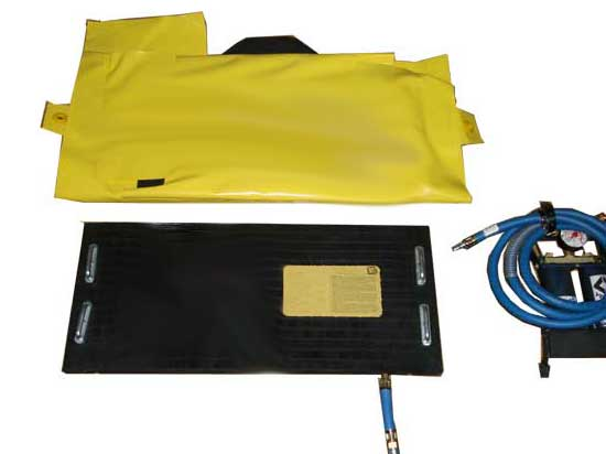 2種規(guī)格(旋轉(zhuǎn)扣型,重量25kg,帶子導(dǎo)向扣型,重量16.9kg),密封面積50×30厘米,軟橡膠材質(zhì),配有快速充泄氣切換接口,1個帶安全壓力表的腳踏高壓氣泵。適用于在地形復(fù)雜的狹窄空間內(nèi)密封直徑在5至48厘米的管道及圓形容器的裂縫。