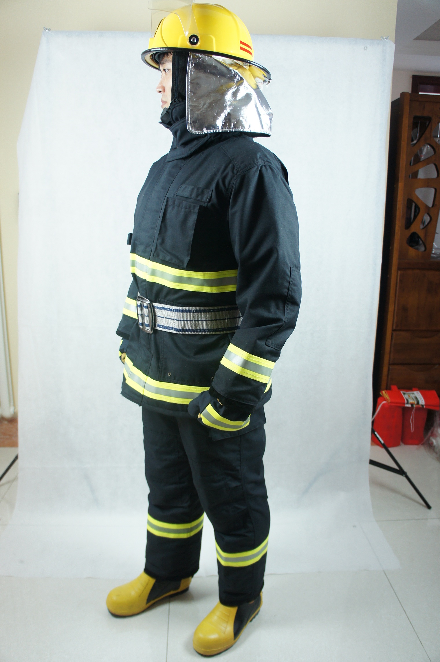 消防員在滅火戰斗時穿著的防護服裝。該服裝是根據GA10-2014的標準要求設計、生產的(該服裝符合GA10-2014的標準要求),并通過了國家消防裝備質量監督檢驗中心的檢測。可用于穿著近火作業防止熱量對人體的侵害,是滅火作業時基本、適宜的個人防護裝備