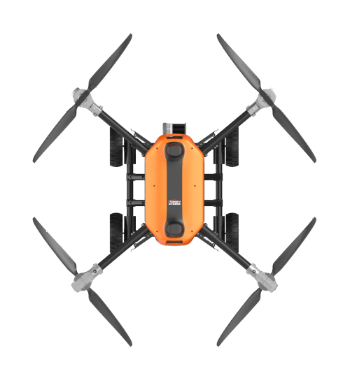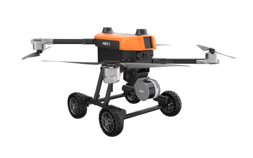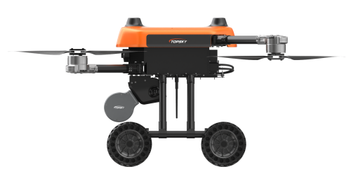 本無人機為北京凌天智能裝備集團研發的陸空兩棲三維偵測建模無人機,采用四旋翼機身設計,載重大,續航長,并且機體折疊標準化負載接口。同時,該無人機具備陸空兩棲功能,可以在地面行駛。